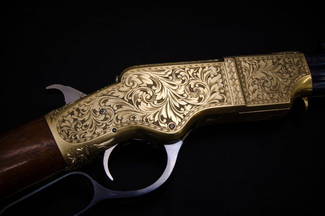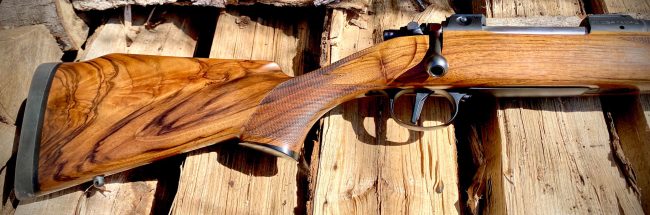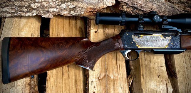 Relime et préparation d’une carabine Browning Blr. Refinition de la crosse à l’huile. Magnifique composition et réalisation par Paul Dubois de scènes de chasse sous le thème Orignal et Chevreuils. Couverture complètes en rinceaux et fond creux.